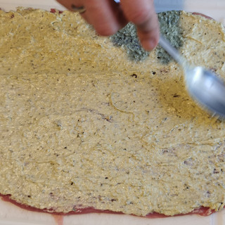 Dann Frischkäse mit Pesto mischen und auf dieser Fläche verteilen. Das Filet straff rollen und zubinden oder mit Zahnstochern oder Rouladennadeln verschließen.